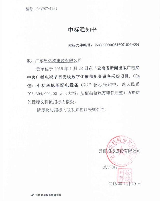 恩億梯電源中標云南廣電局中央廣播電視配套設備采購項目